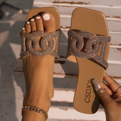รองเท้าแตะผู้หญิงประดับเพชรที่มีสไตล์-รองเท้าแตะส้นแบนประกายเพชรรองเท้าแตะใส่สบายสำหรับฤดูร้อน